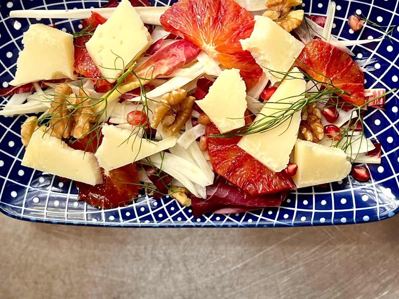 The ingredients follow the rhythm of the season. We built an autumn salad, an evolution of our summer orange and fennel one. This version combines blood oranges, fresh radicchio trevigiano, walnuts, pomegranate seeds, and generous chunks of Provolone del Monaco. The flavors dance between spicy, bitter, sweet, and deep—perfectly balanced by nature itself, just like autumn: a season that holds both sweetness and melancholy in every shade.